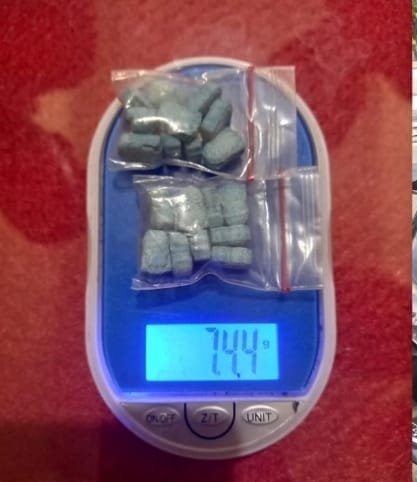 Saat dilakukan penggeledahan, ditemukan BB diantaranya, satu buah plastik warna hitam yang didalamnya terdapat dua bungkus plastik klip kecil yang berisikan 20 butir pil warna biru berlogo minion diduga narkotika jenis ekstasi seberat 7,44 Gram.