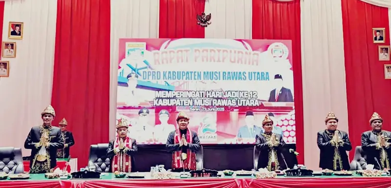 Rapat paripurna dipimpin langsung oleh Ketua DPRD Musi Rawas Utara, Devi Arianto, SH didampingi Wakil Ketua I dan Wakil Ketua II di Griya Iluk di Jalan Lintas Sumatera Kelurahan Muara Rupit, Kecamatan Rupit, dihadiri Gubernur Sumsel, H Herman Deru didampingi Ketua TP PKK Sumsel Feby Deru, seluruh anggota DPRD Kabupaten Muratara, Bupati dan Wakil Bupati Muratara, sekretaris daerah, staf ahli Bupati, asisten, kepala OPD, Camat serta tamu undangan lainnya, senin (23/06/2025).