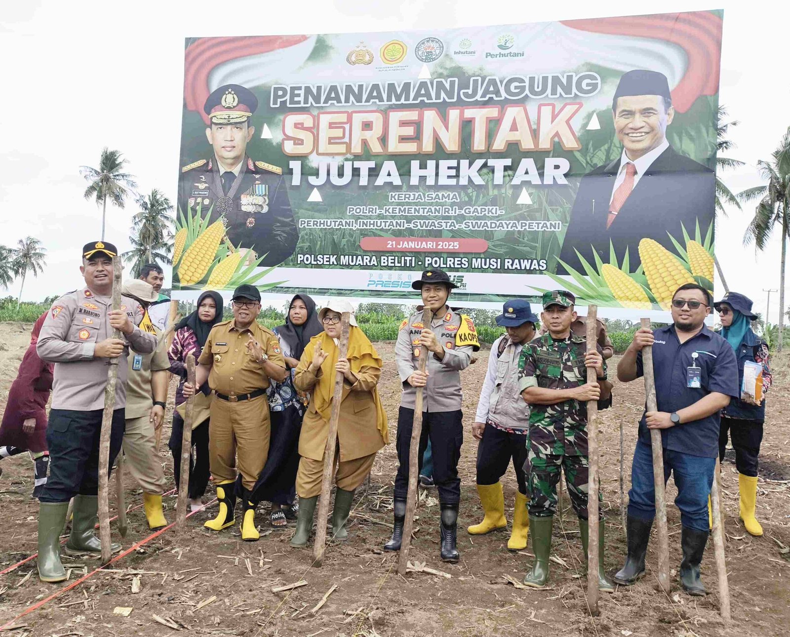 Telah mengikuti serta melakukan penanaman jagung serentak 1 juta hektar, dan 78 hektar lahan ditanam jagung merupakan lahan tumpang sari. Oleh sebab itu, kiranya mohon dorongan/dukungan dari Pemda Mura melalui Ibu Bupati untuk melibatkan pemerintah kelurahan/desa di menanam jagung seluas 1 hektar disetiap desa/kelurahan, kata Kapolres