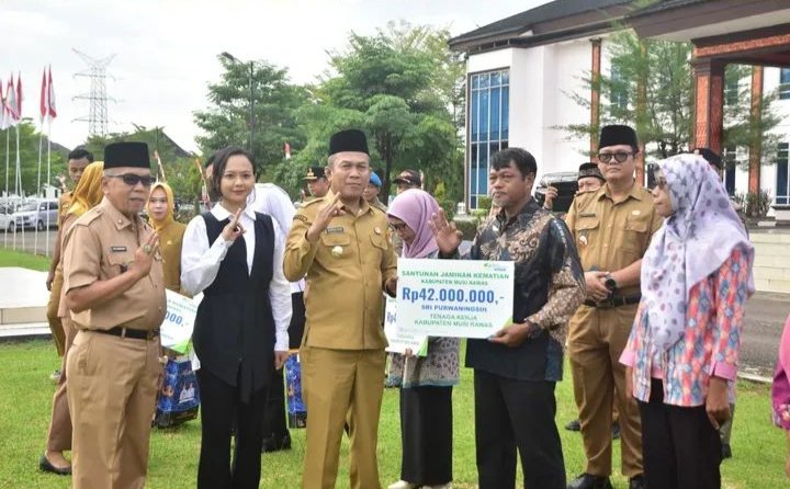 Usai upacara apel pagi bersama, Wakil Bupati Musi Rawas, H Suprayitno, SH menyerahkan bingkisan kepada Aparatur Negeri Sipil dilingkungan Pemerintah Kabupaten Musi Rawas yang memasuki masa purna tugas TMT 1 Juli 2025 . Dan juga pemberian bantuan santunan jaminan kematian dari BPJS Ketenagakerjaan, tenaga kerja Kabupaten Musi Rawas.